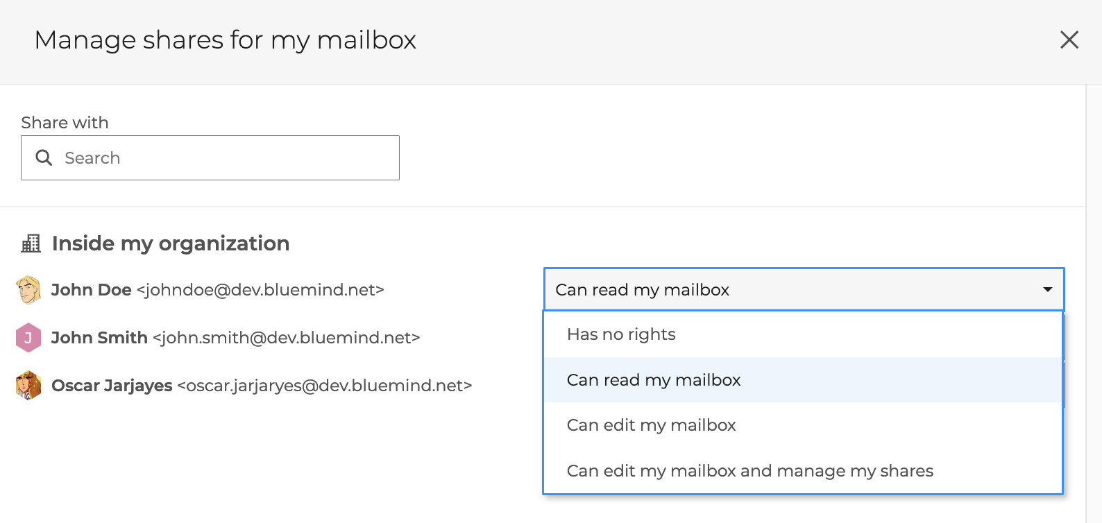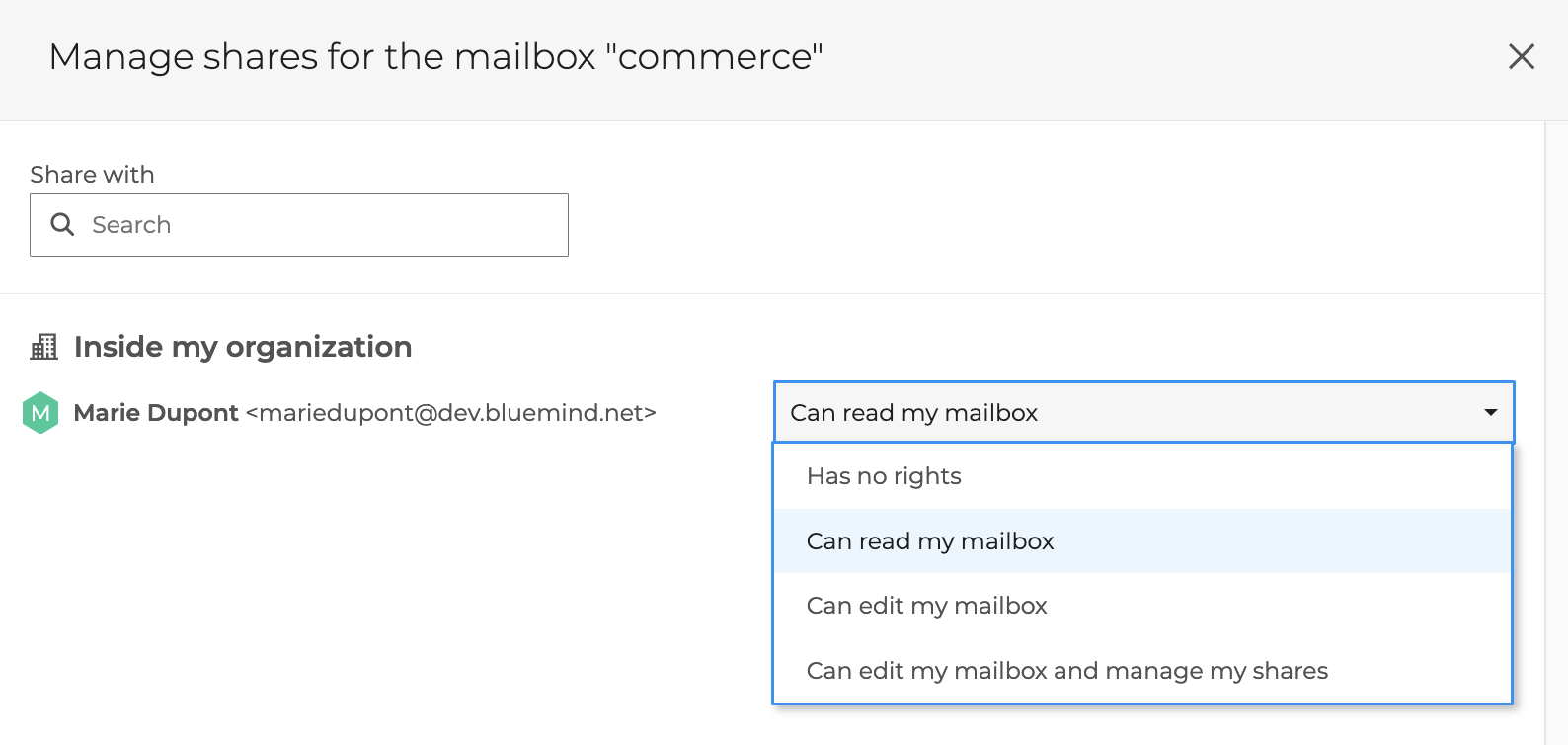 Users can share their mailbox with members of the organization so that they can view messages and folders, edit them and even, depending on the access rights level assigned, manage mailbox shares.