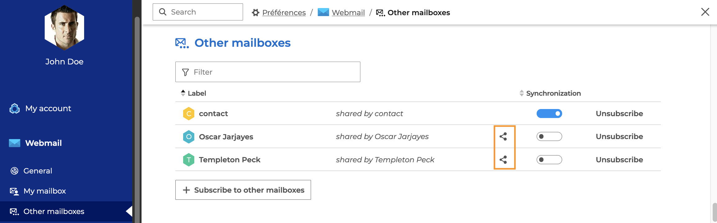 As an administrator, users can also manage shares of individual mailshares (shared by a user) or collective mailshares (created by the administrator) for which they have the appropriate rights and to which they are subscribed.