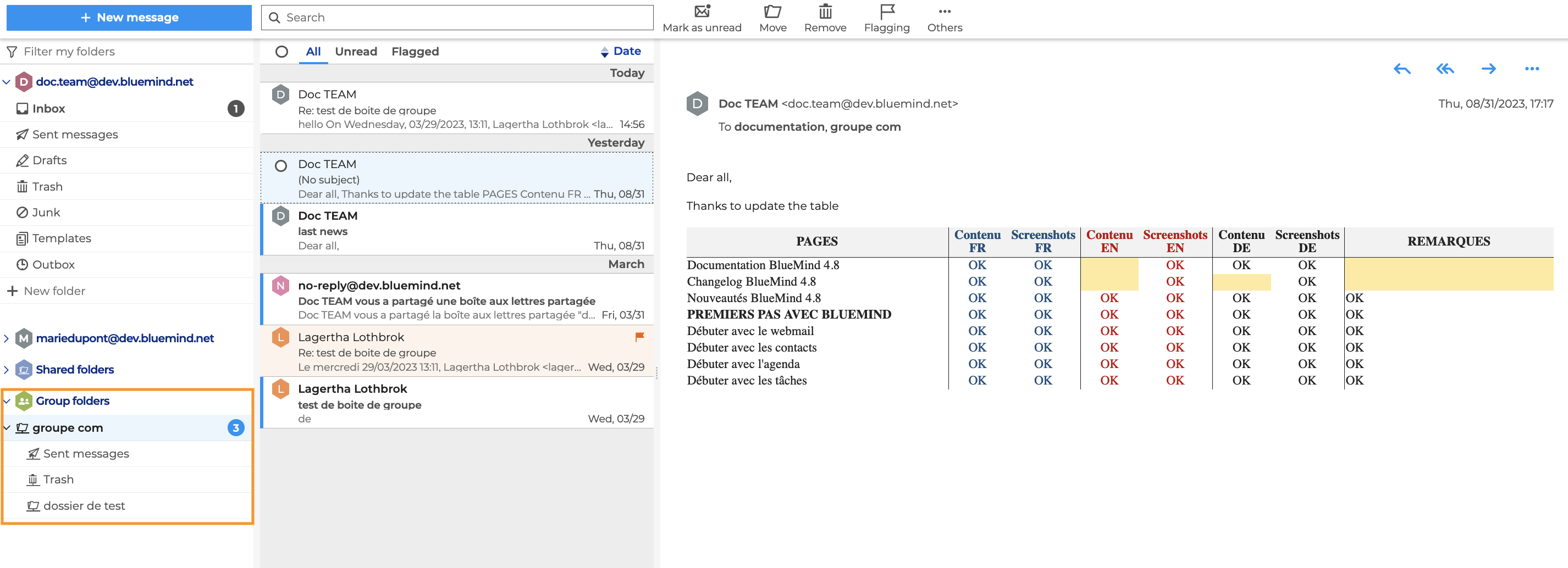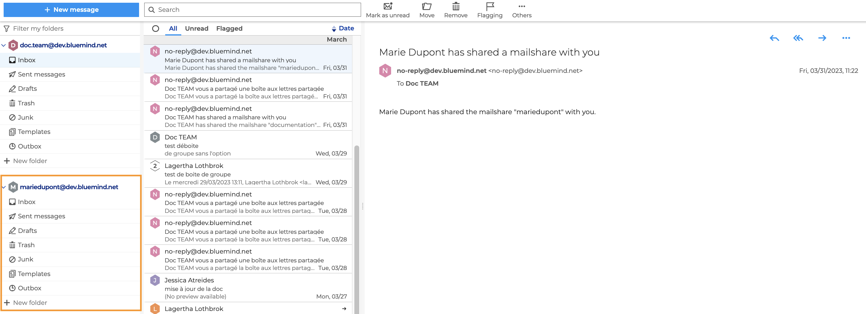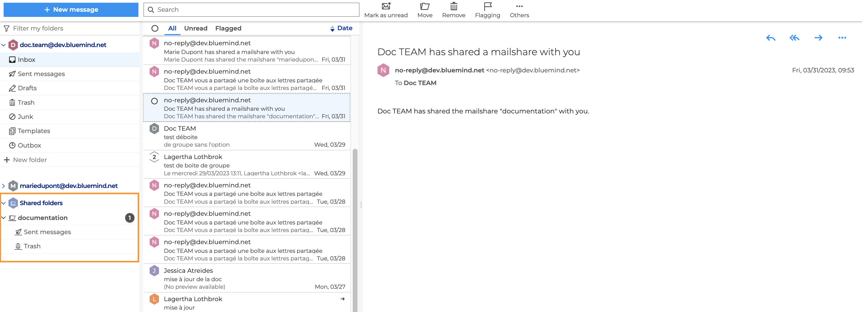 In addition to their personal mailbox, users can access individual mailboxes shared by others as well as collaborative mailboxes created by the domain administrator: group mailboxes and shared mailboxes (also known as "mailshares", "service mailboxes", or "functional mailboxes").