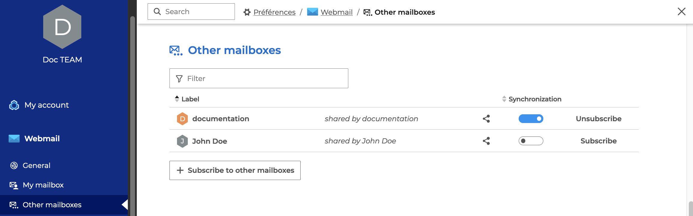 Once the notification is received, to view the mailbox in their email or connected mobile software and devices, the user must activate the subscription in their mail settings: Preferences > Mail > Other mailboxes :