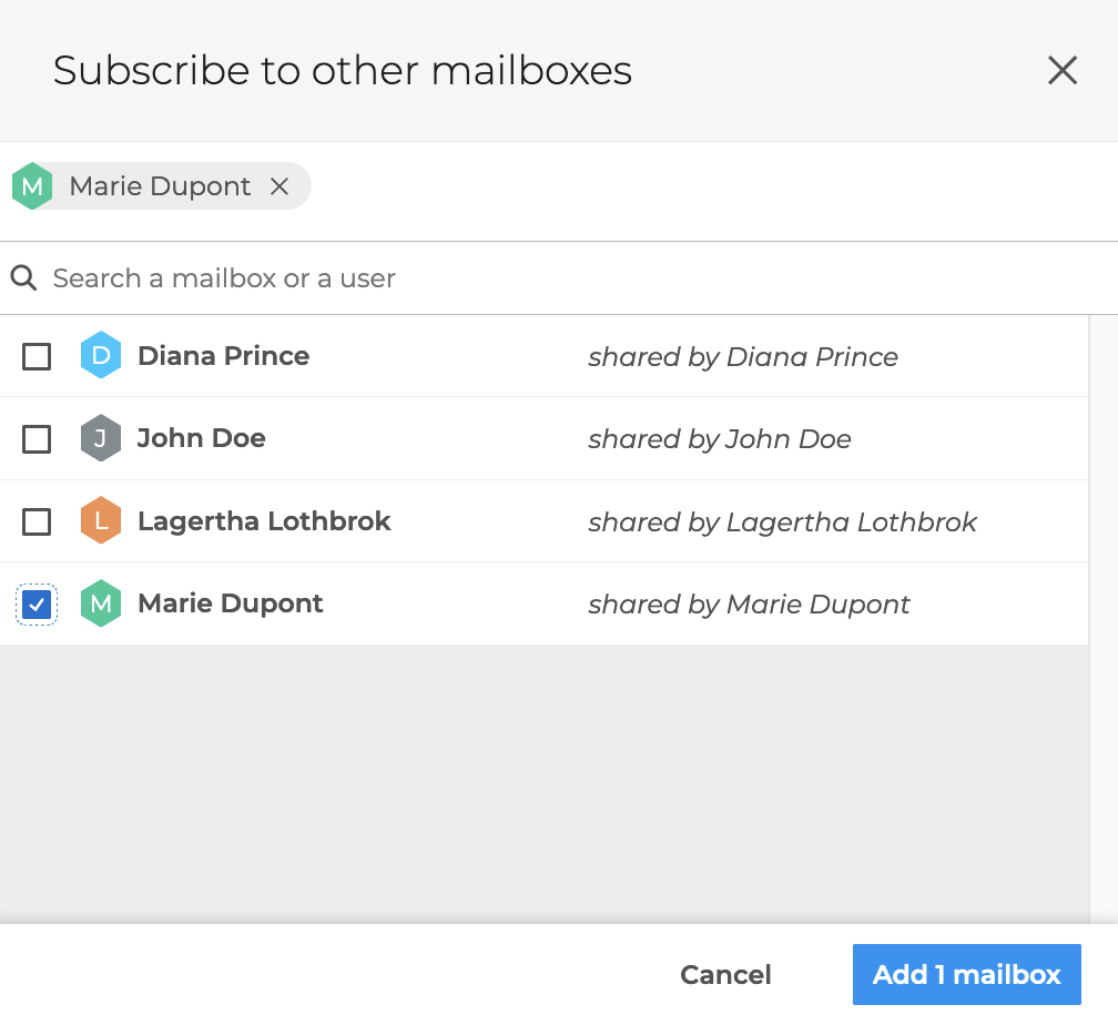 Where applicable, the interface displays a list of mailboxes to which the user is already subscribed, as well as mailboxes for which he has received share management rights.