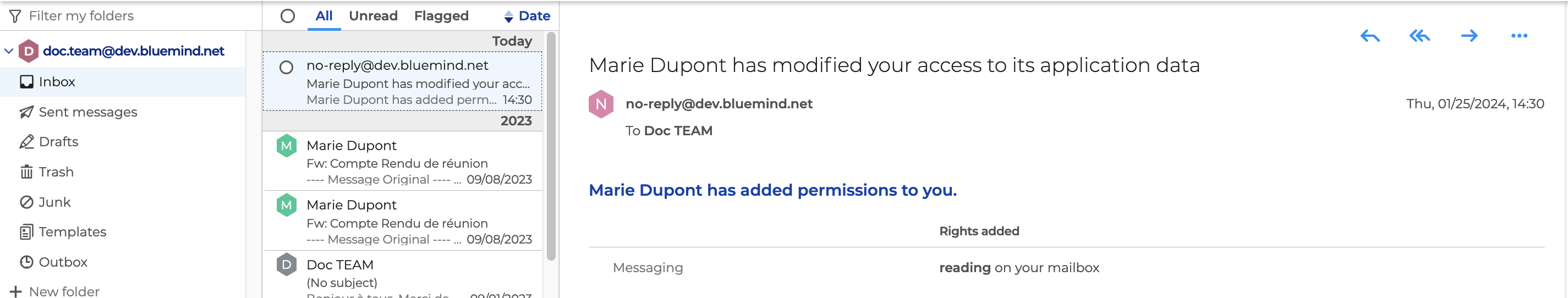 When access rights to a mailbox, whether individual or group, are assigned to a user (see Sharing a mailbox), they receive an email notification :
