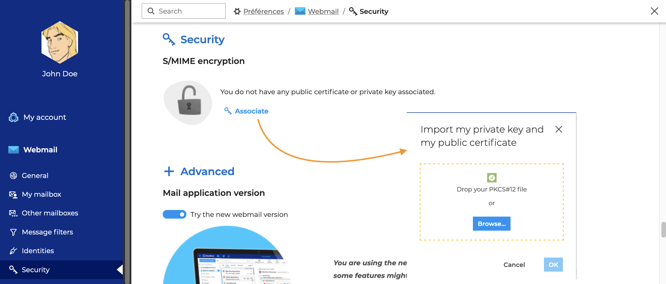 - go to Settings: Preferences - Mail - Security and click on "Associate":