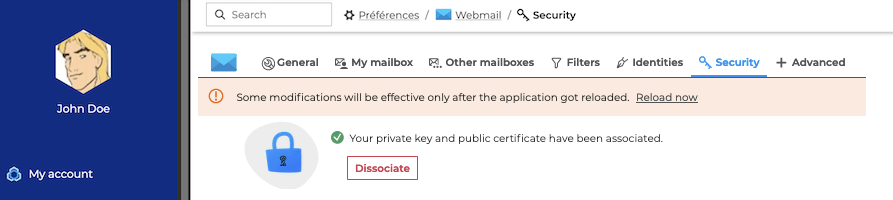 - The message "Your private key and public certificate have been associated" indicates that the key is active. Click on "Reload now" in the warning banner or restart webmail: