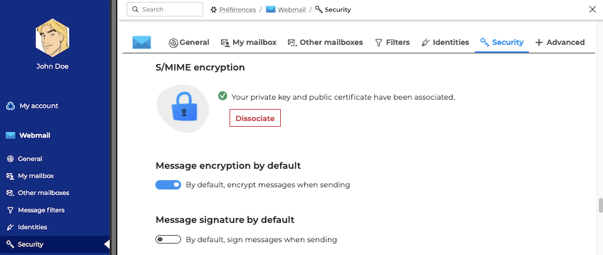 To delete thekey, click on "Dissociate". It will then no longer be possible to send or receive secure messages.