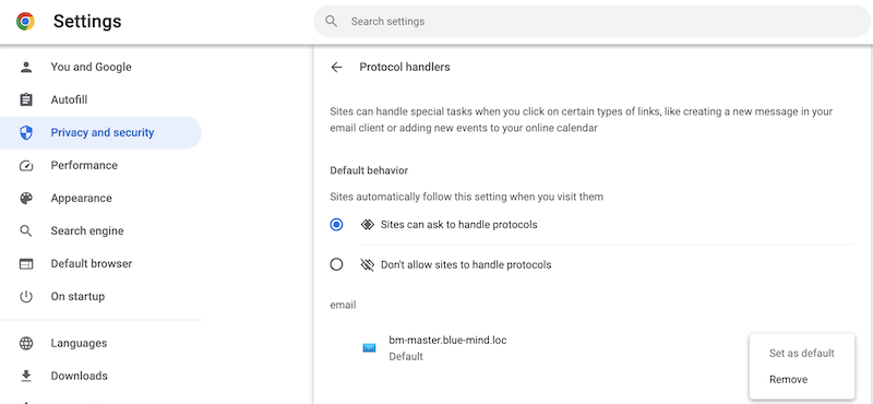 - check the option "Sites can ask to handle protocols" and verify that BlueMind is in the list of "email" sites