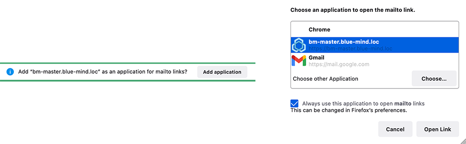 Then, after clicking on a mailto link, choose the BlueMind application to open it. By checking "Always use this application to open mailto links", BlueMind becomes the default e-mail application