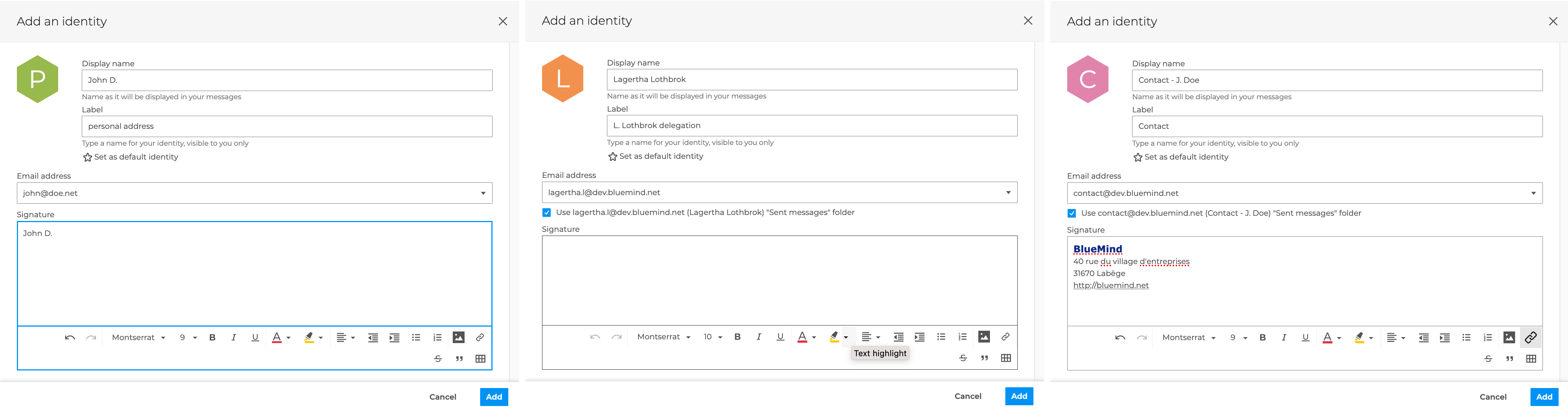 BlueMind lets you manage several identities for the same account, with a label, an email address, and a different signature for each, allowing you to customize the sender and the signature when composing messages.