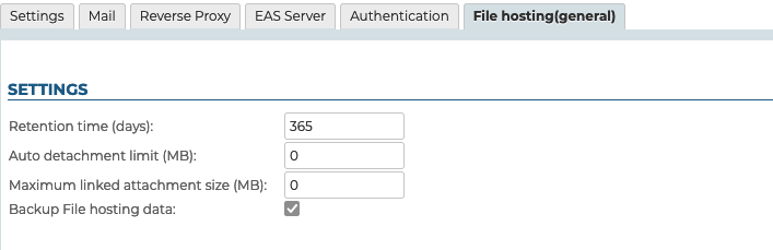- Aufbewahrungszeit (Tage) : Anzahl der Tage, an denen Dateien auf dem Server ab dem Datum ihrer ursprünglichen Übermittlung aufbewahrt werden.