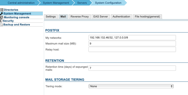 Auf diesem Reiter kannst du die Einstellungen für Postfix sowie für die Aufbewahrung und Speicherung des Systems vornehmen.