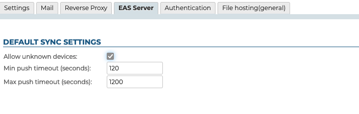 Der Reiter "EAS-Server" bietet Zugang zu den Konfigurationsoptionen des Exchange Active Sync-Servers, der die Synchronisation von Mobilgeräten ermöglicht.