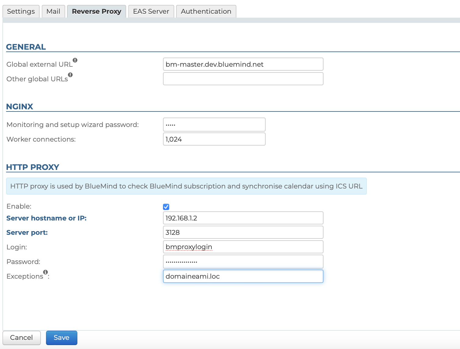 In verschiedenen Szenarien, z. B. bei der Abfrage von externen Kalendern, erfordern einige Installationen die Verwendung eines HTTP-Proxy-Servers. Es ist möglich, einen solchen Proxy-Server einzurichten, über den die von BlueMind durchgeführten externen Anfragen laufen.