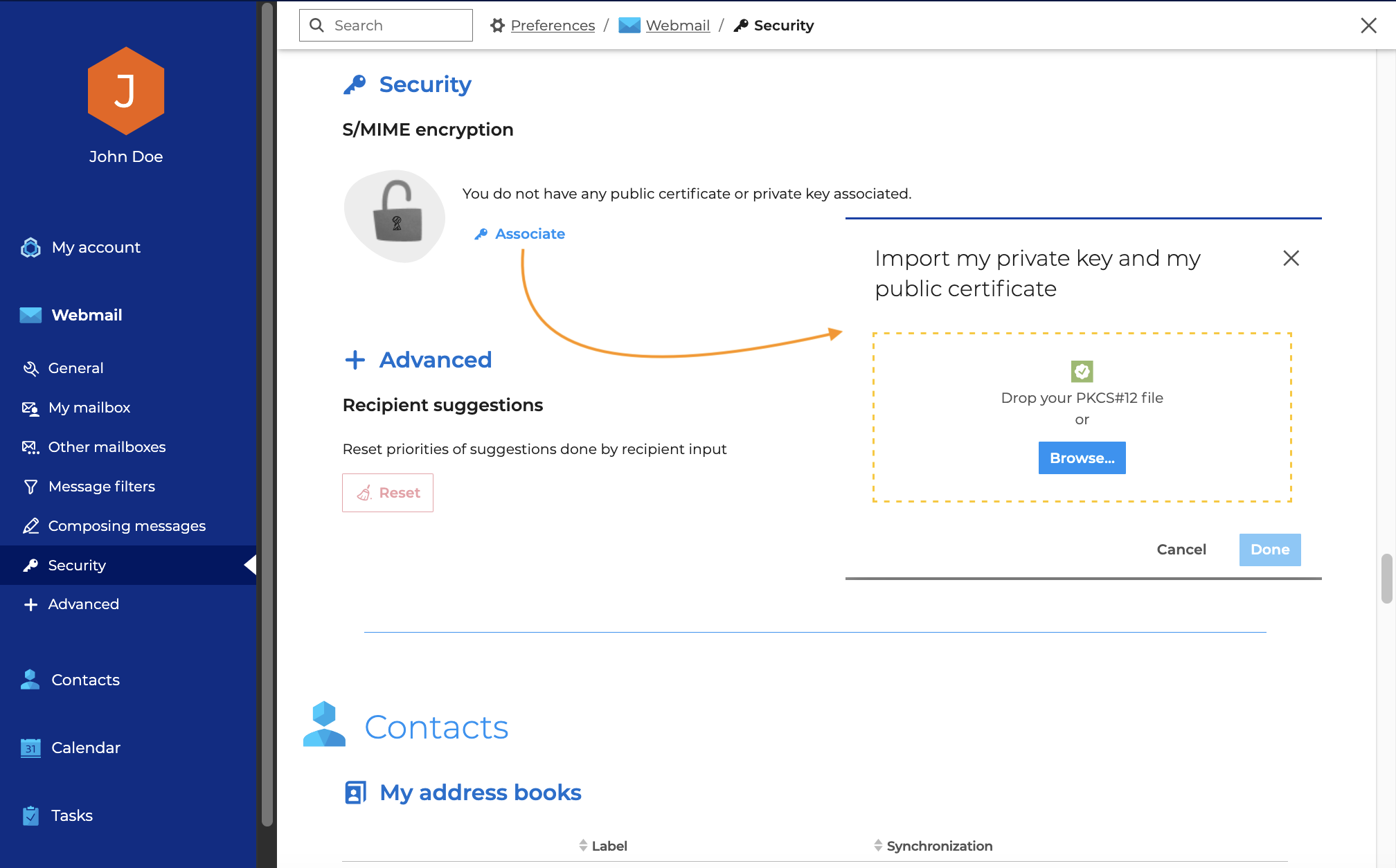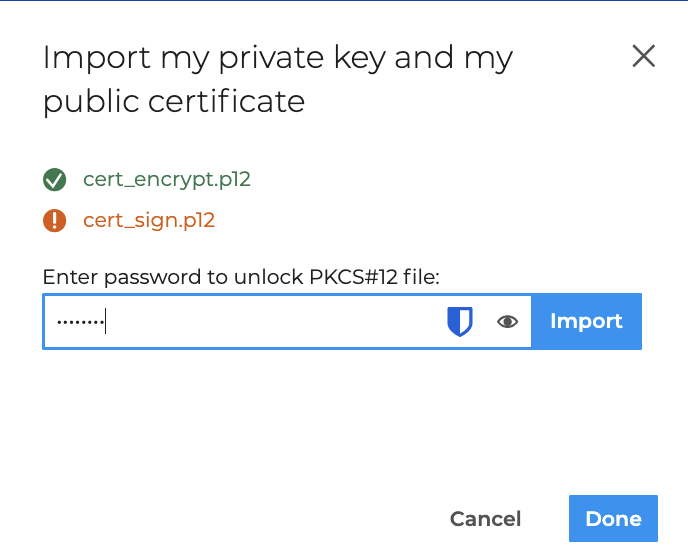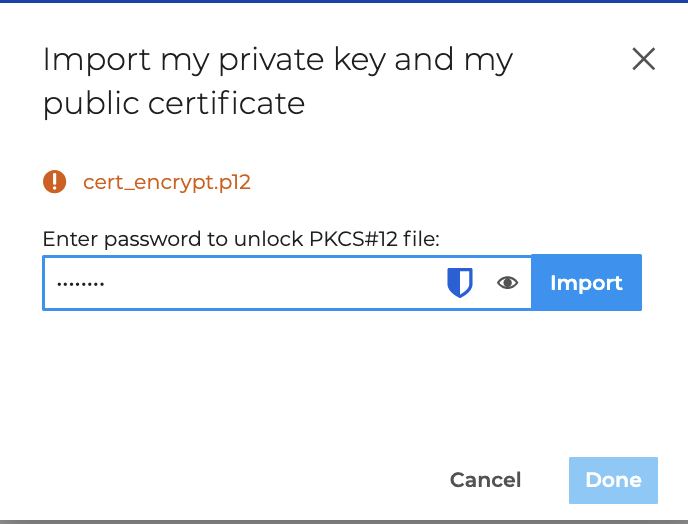 - Wählen Sie die Datei im Format PKCS#12, geben Sie das Passwort ein, um sie zu entsperren und klicken Sie auf Importieren