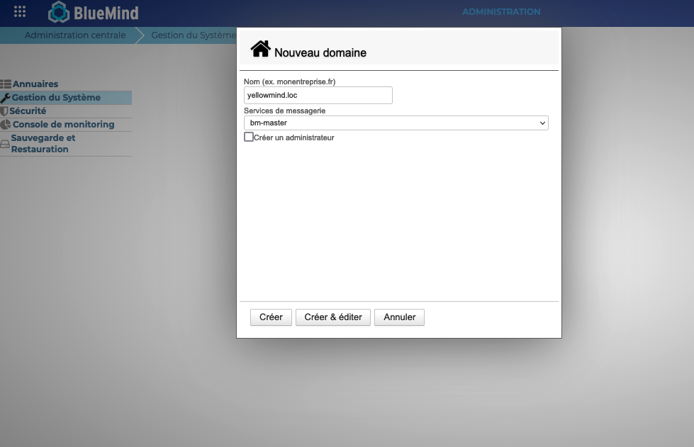 - Si le domaine de destination n'existe pas encore dans BlueMind, le créer :