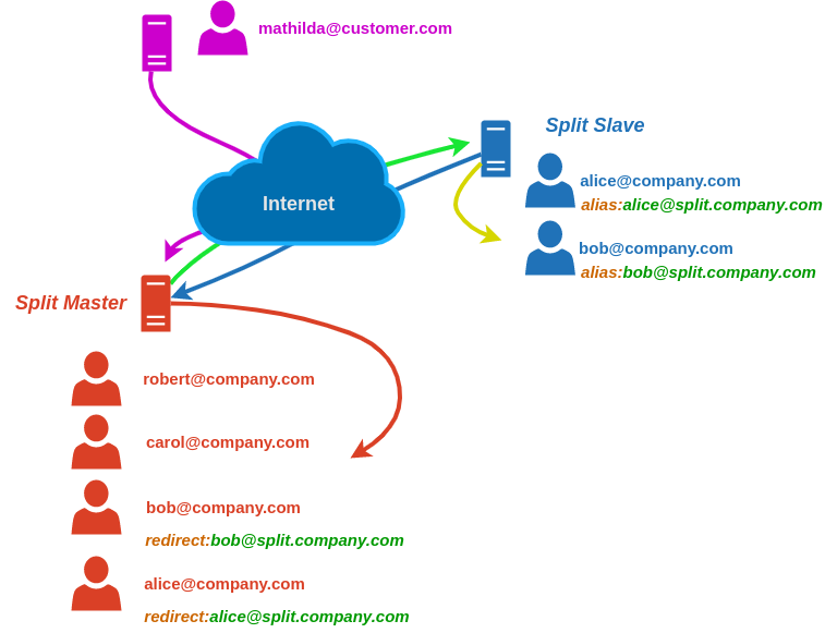 - Le compte Alice a une adresse de redirection vers alice@split.company.com : le serveur master résout le nom split.company.com et envoie le message vers le serveur slave ⇒ le message suit avec la flèche verte.