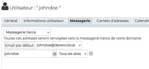 - Un nouveau formulaire est alors proposé, qui permet de sélectionner tout ou partie des adresses mails configurées pour l'utilisateur, sachant que tout courriel arrivant à destination de ces adresses sera renvoyé au système de messagerie tiers :