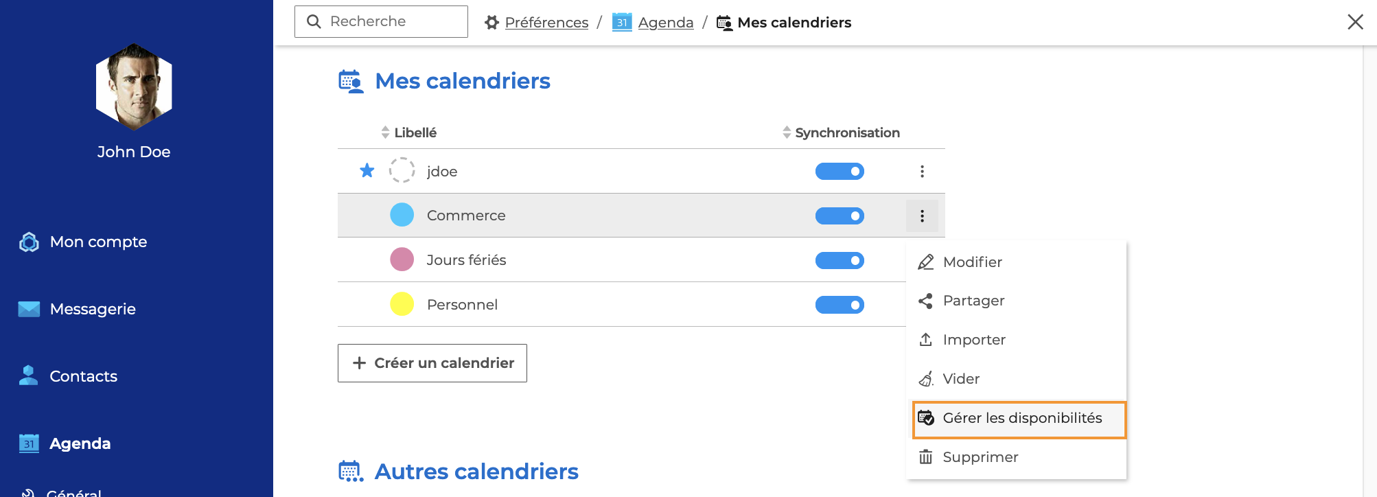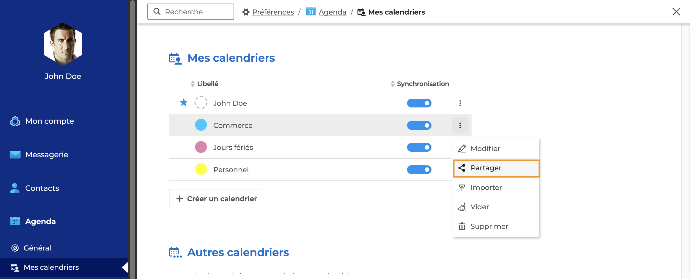 La gestion des droits d'accès aux calendriers s'effectue dans les paramètres de l'agenda, en allant sous Préférences > Agenda > Mes calendriers