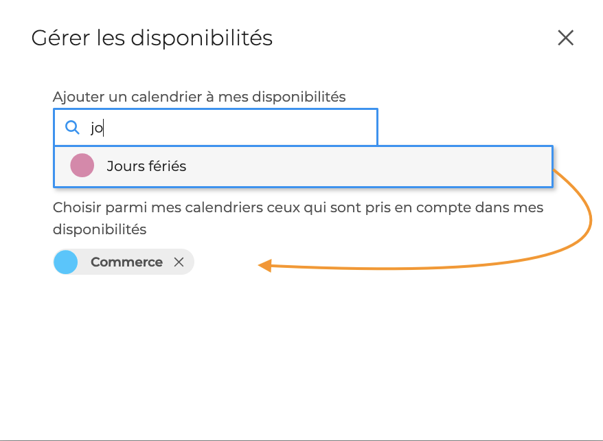 Pour cela, aller dans le menu du calendrier et cliquer sur "Gérer les disponibilités" pour ouvrir la fenêtre popup :