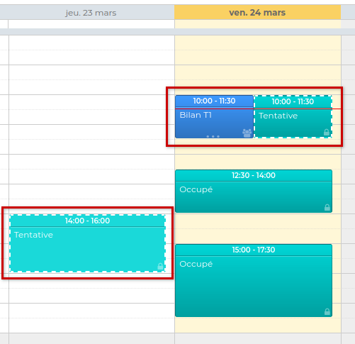 Lorsque des événements sont en attente de réponse par le propriétaire, ils apparaissent entourés de pointillés avec le libellé "Tentative" (signifie "provisoire" en français) :