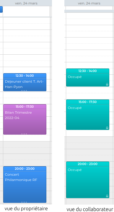 afficher le calendrier de l'utilisateur dans la vue de leur Agenda. Les évènements sont alors visibles avec la simple mention "Occupé" :