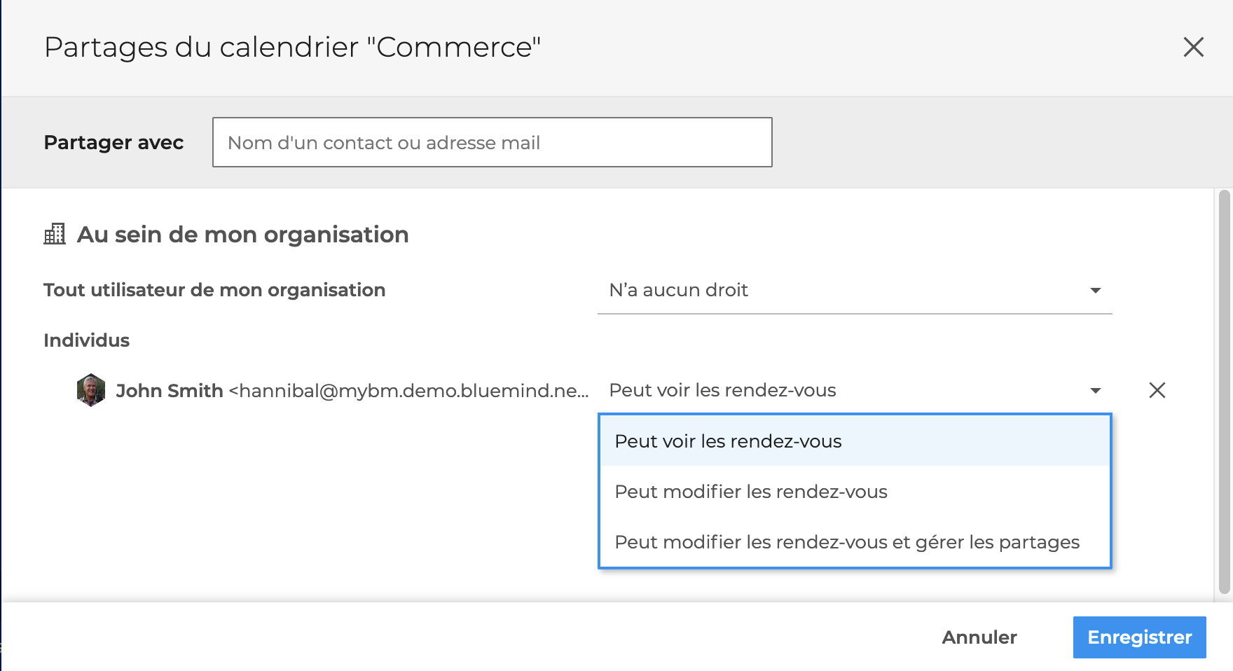 Peut m'inviter à une réunion ⇒ partage minimum - Le(s) utilisateur(s) sélectionné(s) ne peuvent pas voir le calendrier de l'utilisateur mais peuvent l'inviter. L'autocomplétion proposera le nom de l'utilisateur dans le formulaire d'ajout de participant à un évènement.