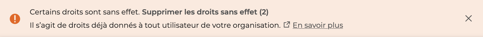 Modifier les niveaux de droits utilisateurs signalés par l'icône ou cliquer sur "Supprimer les droits sans effet" pour les supprimer de la liste et leur attribuer le niveau de droits de partage public.
