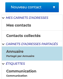 En plus des carnets d'adresses personnels, les utilisateurs peuvent accéder à des contacts supplémentaires via l'Annuaire, un carnet d'adresses partagé par défaut à tous les utilisateurs ainsi que les carnets d'adresses partagés par d'autres utilisateurs.
