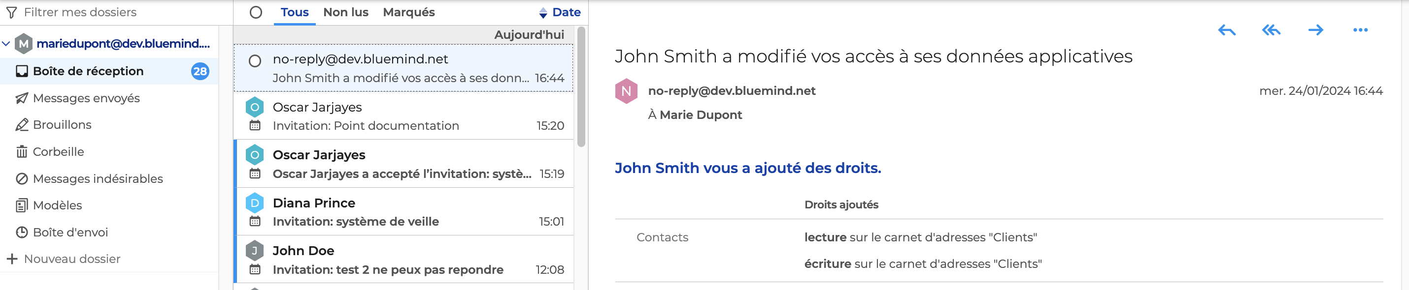 Lorsqu'un utilisateur donne des droits d'accès son carnet d'adresses, l'utilisateur auquel les droits de partage ont été attribués, reçoit une notification par e-mail.