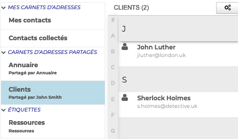 Une fois l'abonnement validé, le carnet d'adresses apparait dans la liste des carnets d'adresses partagés (colonne de gauche) et les contacts du carnet dans la liste des contacts (colonne du milieu)