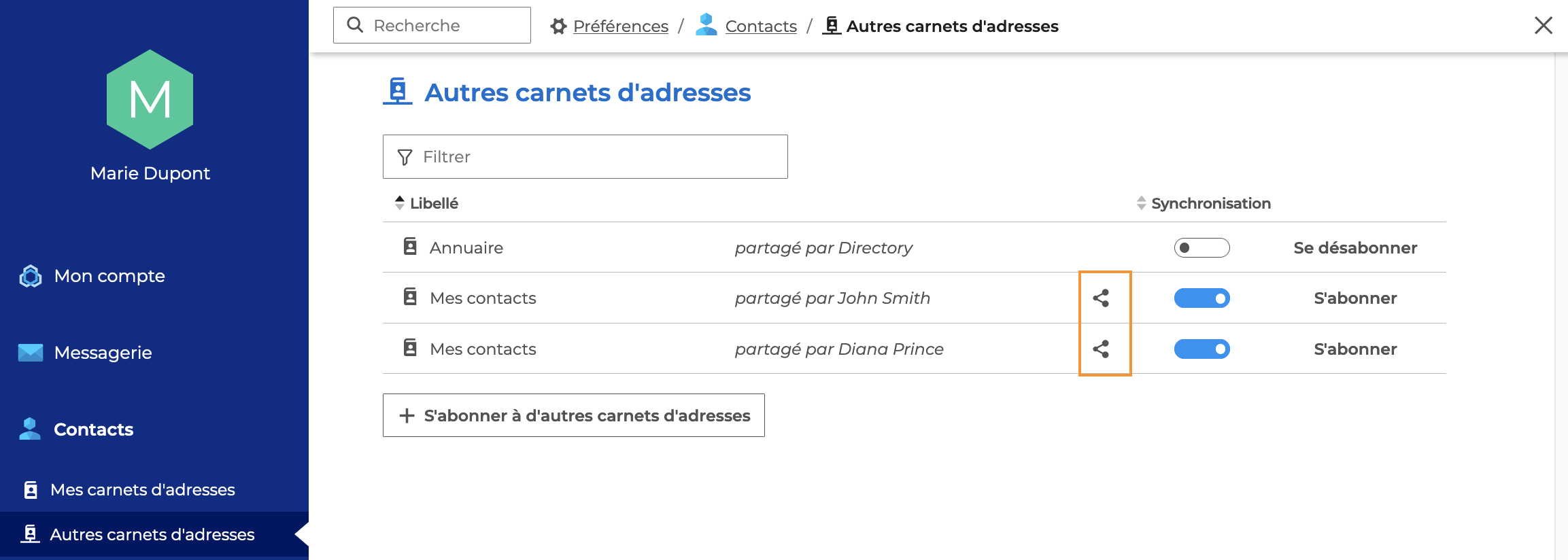 Une fois la notification reçue, l'utilisateur doit activer l'abonnement au carnet d'adresses dans ses paramètres des contacts : Préférences > Contacts > Autres carnets d'adresses