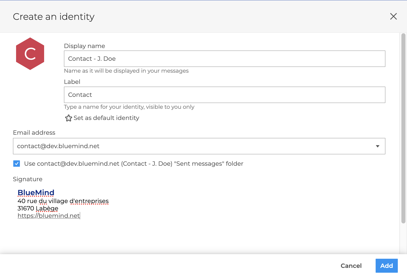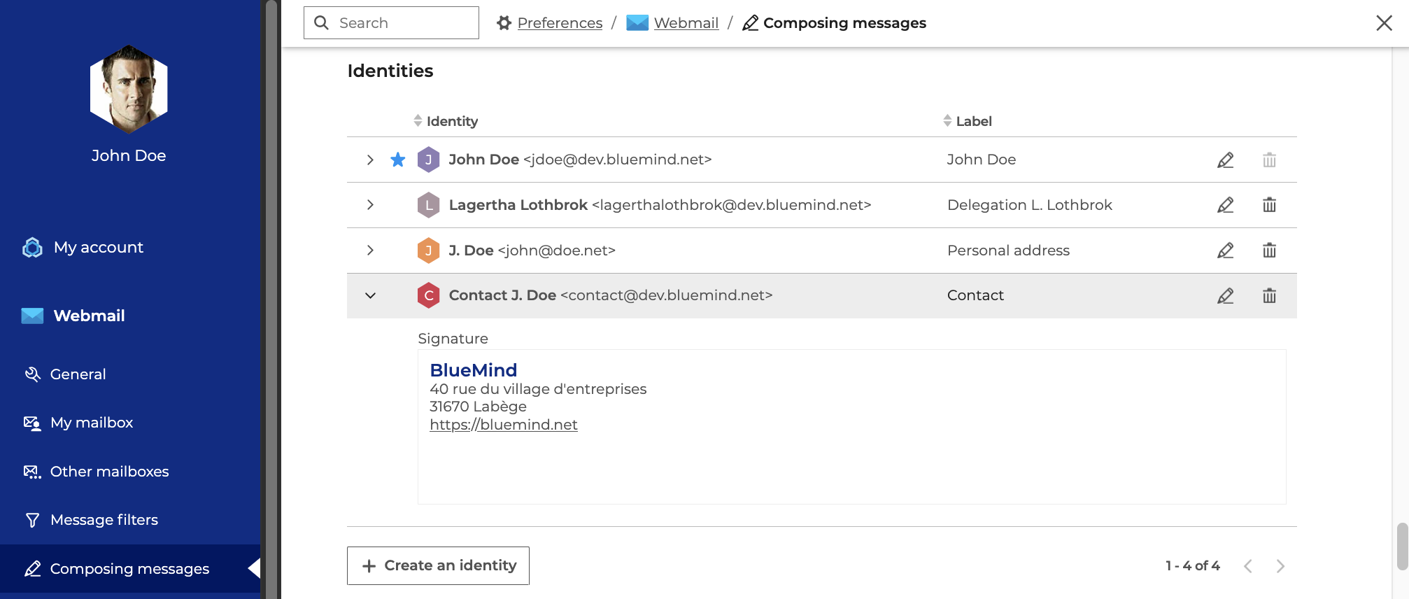 BlueMind lets you manage several identities for the same account, with a different wording, e-mail address and signature for each one, allowing you to personalize the sender and signature when writing messages.