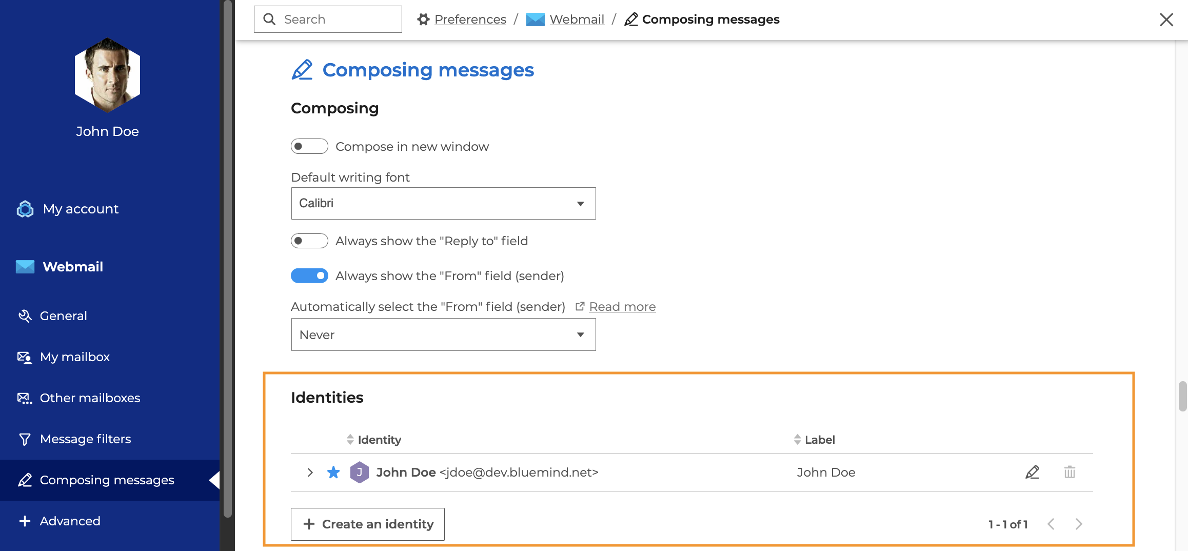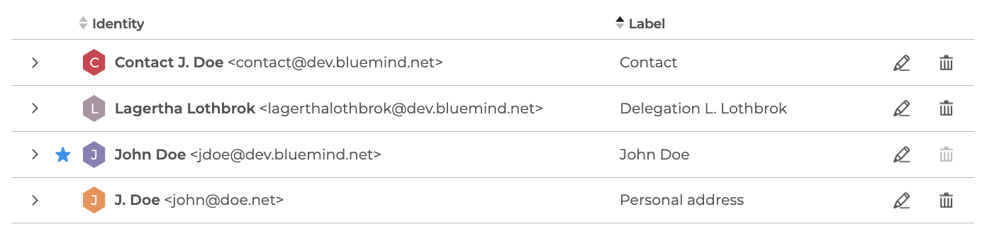 A default identity is created on the user's main address. You can add as many identities as you like to, for example, write as a delegate, write in the name of a mailshares, write with one of your own email aliases, or have multiple signatures for the same address. You can also choose a default identity, i.e. the identity that will be used when you create a new message.