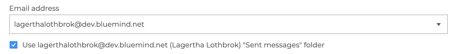 When the email address of a group box or delegating user - shared at least with the "Can edit" level - is selected, an option appears to choose the folder to be used for storing sent emails : check the box to use the shared mailbox folder, or leave it unchecked to use the user's default folder