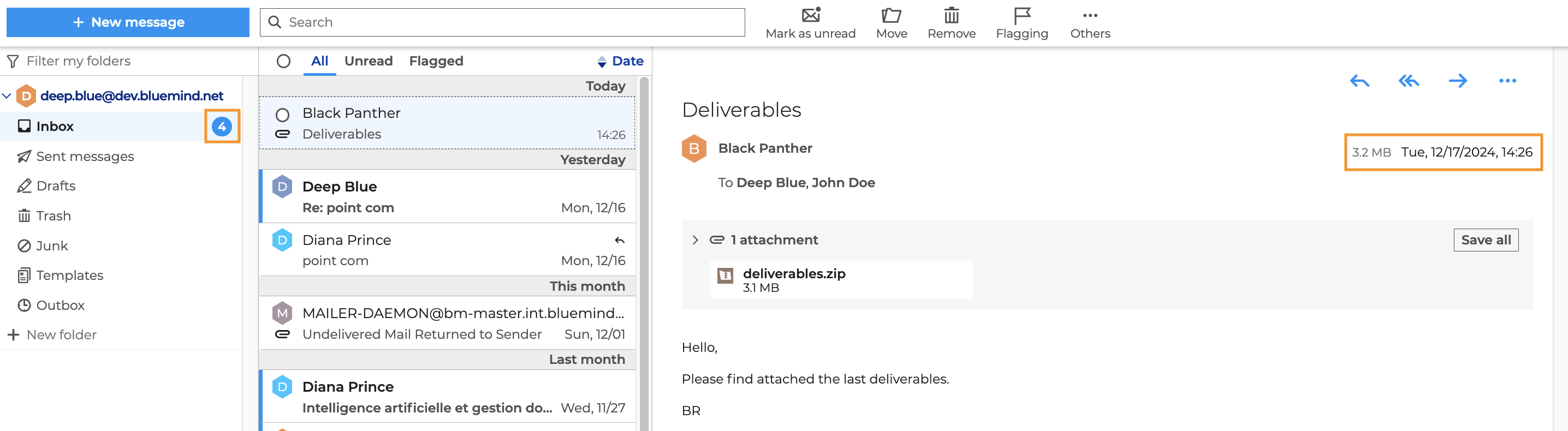 For further information, see Using the folder list and Using Shared Mailboxes.: the list of messages contained in the folder selected in column A. You can use the filters at the top of the list to select the types of messages you want to display. Details and possible actions appear when you hover over a message. The column width can be adjusted to accommodate message previews or to adapt to the type of screen used. For further information, see Managing the Message List.