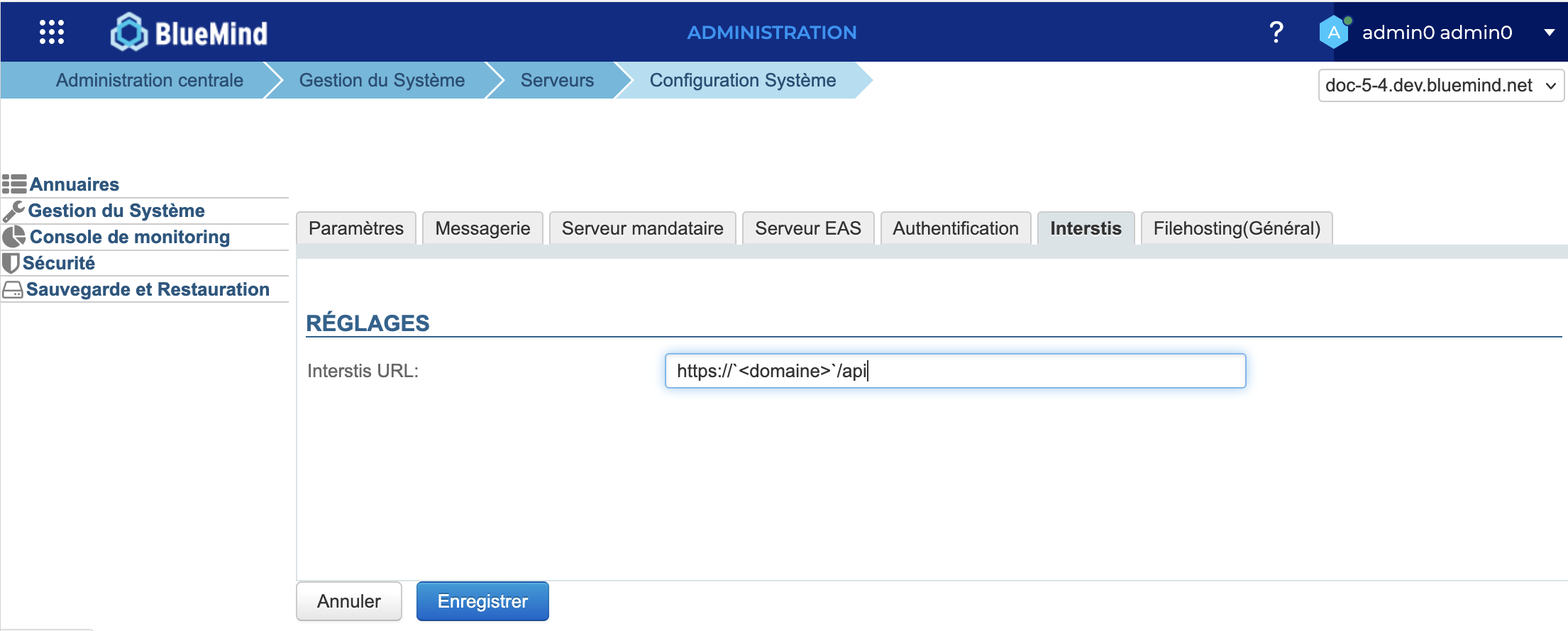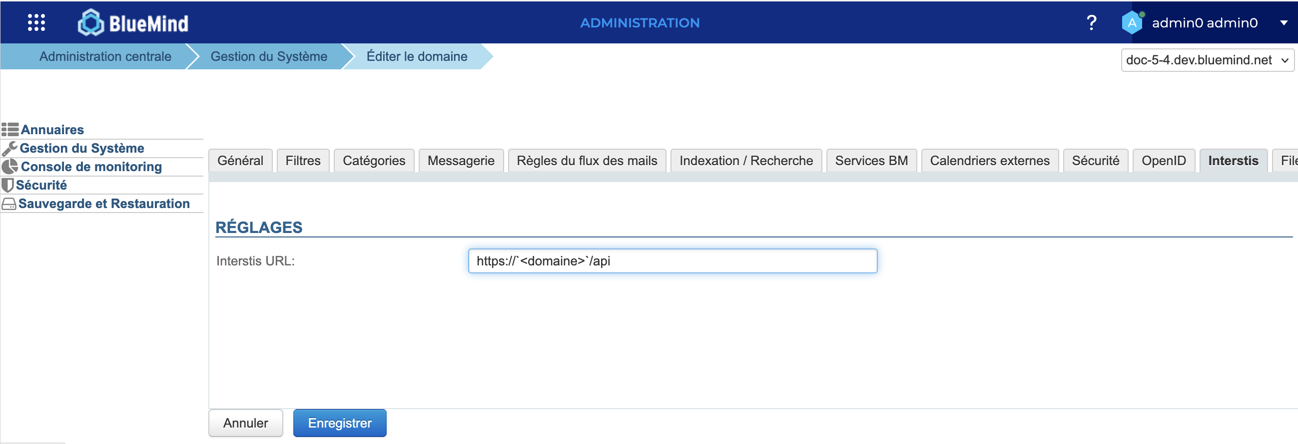 La connexion de BlueMind à Interstis pour l'ensemble des domaines se fait depuis la configuration système de la console d'administration :