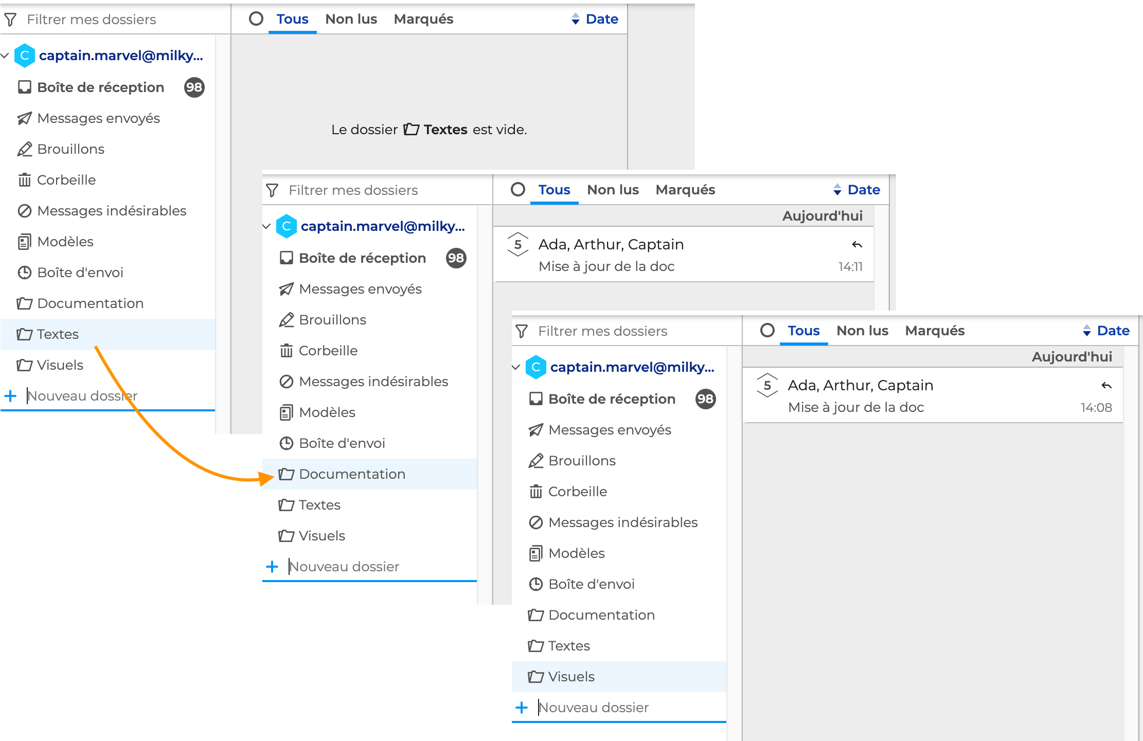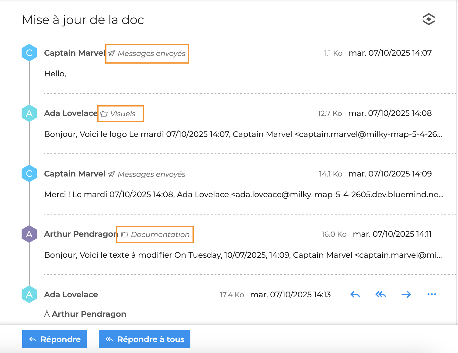 Par exemple ici, la conversation a été déplacée du dossier "Textes" vers le dossier "Documentation". La conversation a donc disparu du dossier "Textes" et est visible dans le dossier "Documentation". La conversation est toujours visible dans le dossier "Visuels" car un message de la conversation est classé dans ce dossier.