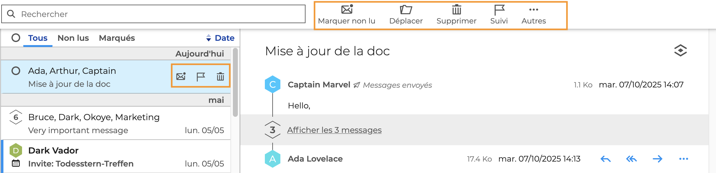 Les menus et boutons d'actions sur une conversation dans son ensemble sont les mêmes que pour Classer et suivre les messages lorsque le mode conversation n'est pas activé.