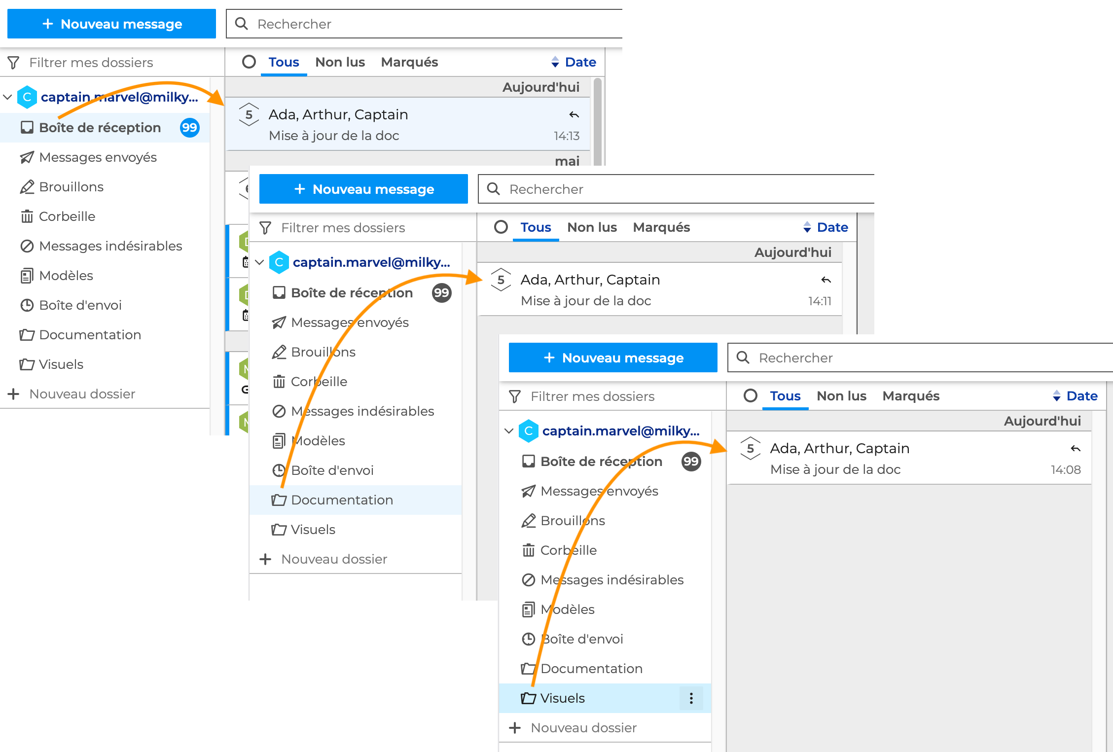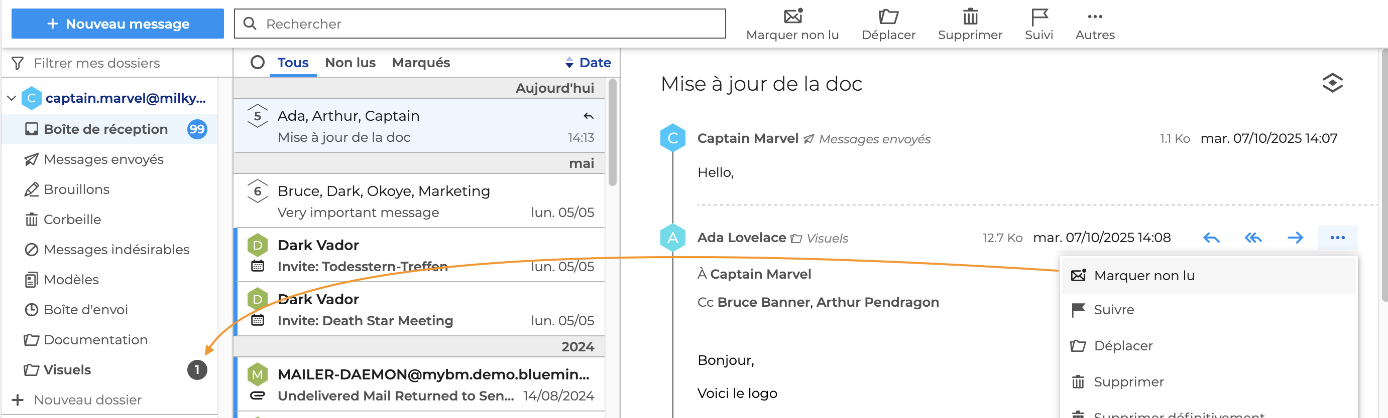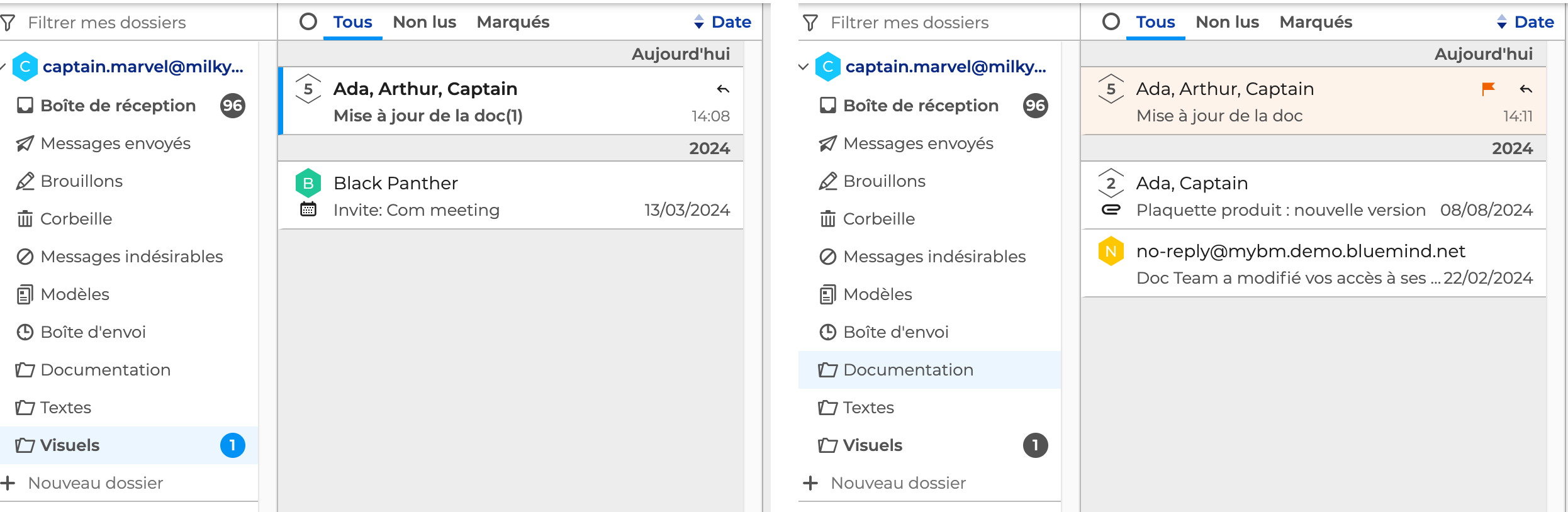 Par exemple ici, la conversation est marquée comme non lue dans le dossier "Visuels" et comme importante dans le dossier "Documentation"