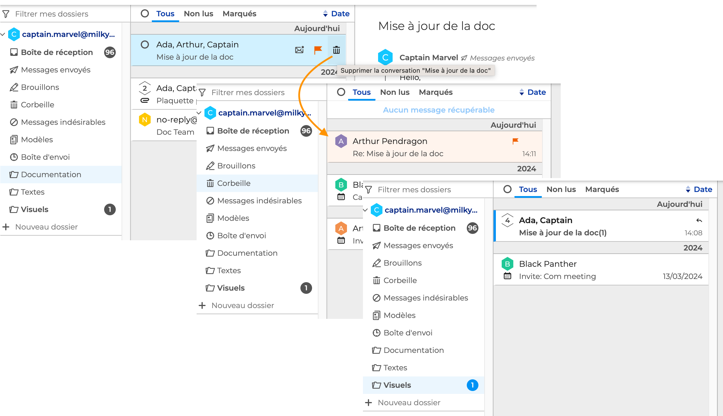 Par exemple ici, la conversation du dossier "Documentation" est placée dans la corbeille. Le message appartenant au dossier "Documentation" est dans la corbeille. La conversation est toujours visible dans le dossier "Visuels" mais sans le message placé dans la corbeille.