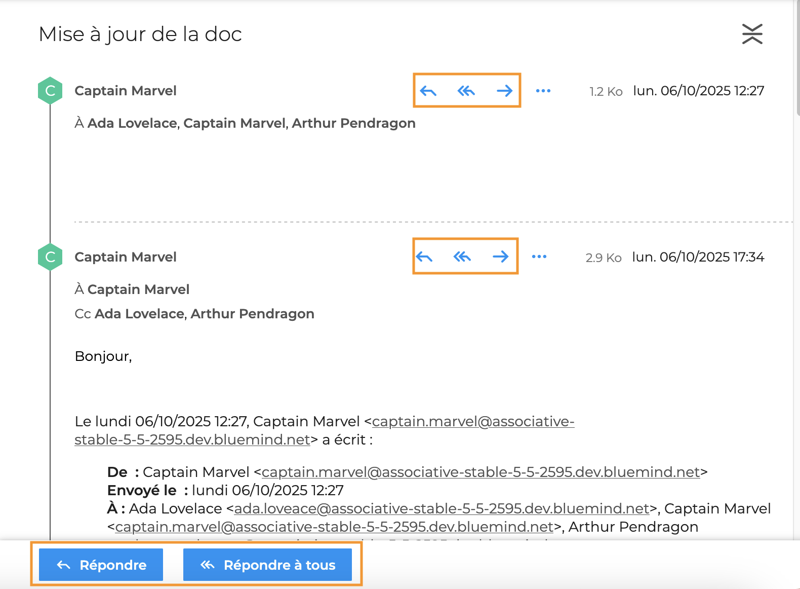 Pour répondre au dernier message de la conversation, cliquer sur les boutons "Répondre" ou "Répondre à tous" en bas de la page.