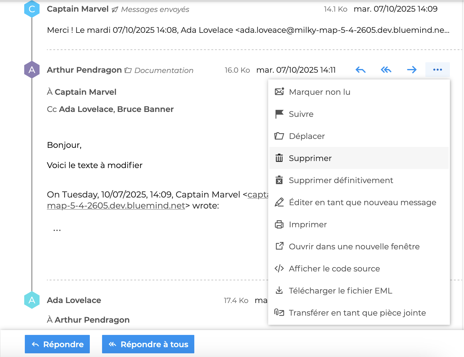Il est alors possible d'y répondre ou de le transférer. Depuis le menu, le message peut également être déplacé, suivi, supprimé, édité, imprimé ou affiché dans une nouvelle fenêtre.