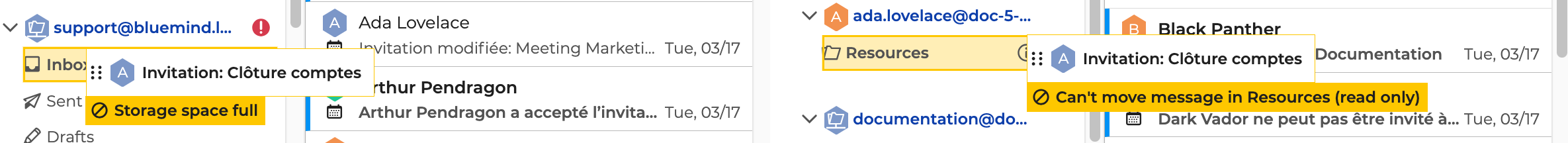 Mit BlueMind können Sie Nachrichten und Unterhaltungen in Ihre persönlichen Ordner sowie in die für Sie freigegebenen Ordner verschieben. Wenn die Nachricht oder die Unterhaltung nicht verschoben wird, gibt es zwei mögliche Fälle: