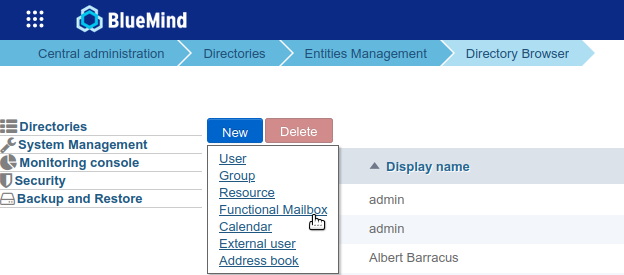- Von der Startseite der Verzeichnisse-Verwaltung aus klicken Sie auf "Funktionale Mailbox erstellen" oder von der Liste der Verzeichniseinträge aus benutzen Sie die Schaltfläche Neu > Funktionale Mailbox: