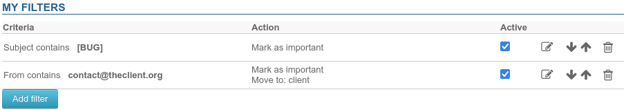 Das Funktionsprinzip ist das gleiche wie bei den Benutzerfiltern (siehe Anwenden von Sortierfiltern und Aktionen), aber die Schnittstelle unterscheidet sich, und im Gegensatz zur Benutzerschnittstelle können hier keine bedingten Filter gesetzt werden.