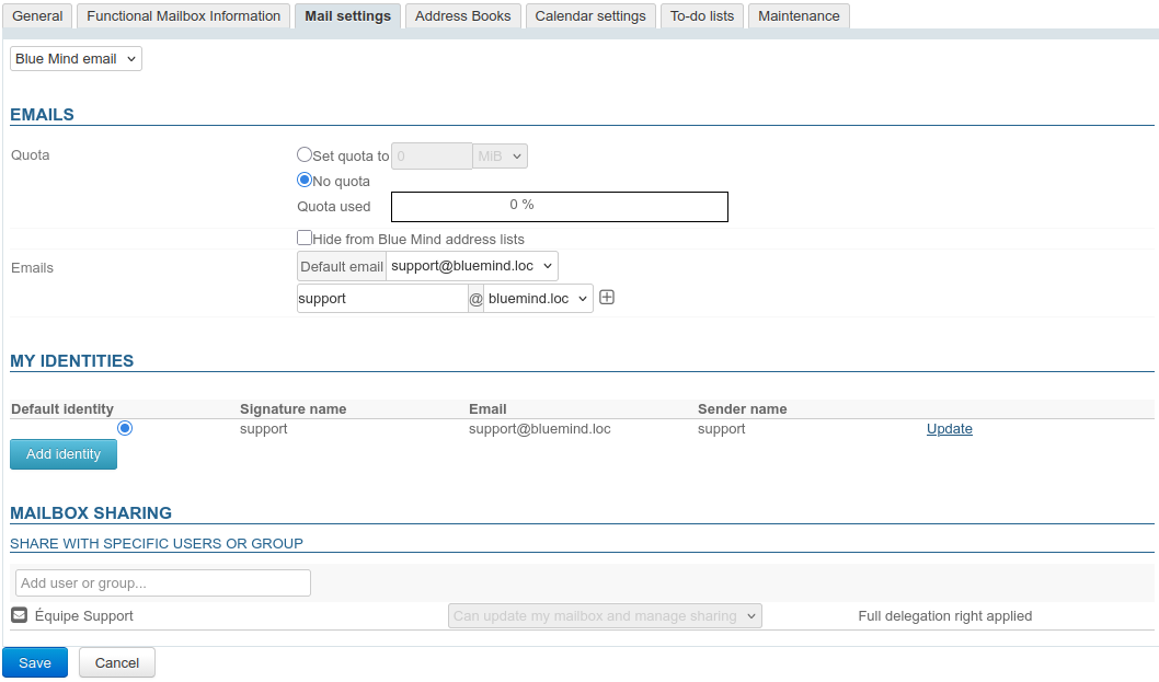 Diese Boxen haben keine Anmeldedaten, so dass es nicht möglich ist, sich in ihrem Namen in BlueMind anzumelden oder ein Konto in einem Fat Client zu erstellen: Rechte (Lesen, Schreiben in ihrem Namen usw.) müssen Benutzern gegeben werden, die sie dann in BlueMind oder in einer Client-Software verwenden können.