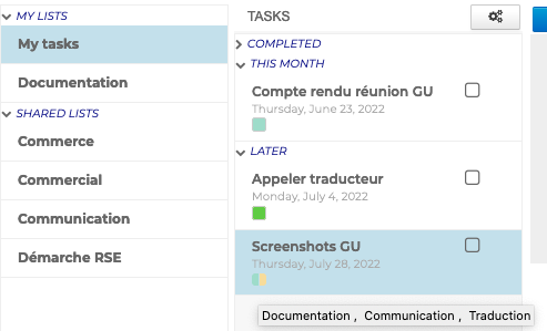 Es ist möglich, so viele Kategorien wie gewünscht zuzuweisen. Die Kategorien sind dann auf dem Aufgabenblatt durch farbige Symbole sichtbar (maximal 2). Wenn Sie mit der Maus darüber fahren, wird die vollständige Liste der Kategorien angezeigt, die dem Ereignis zugeordnet sind.
