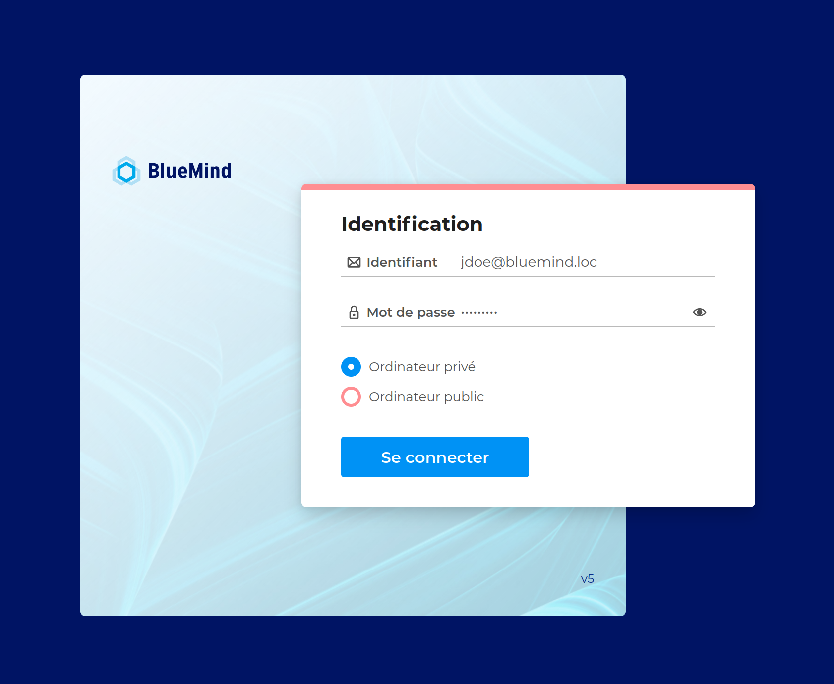 L'accès à BlueMind se fait au moyen d'un navigateur compatible : une fois sur la page à l'adresse donnée par les administrateurs, renseigner les identifiants de connexions du compte :