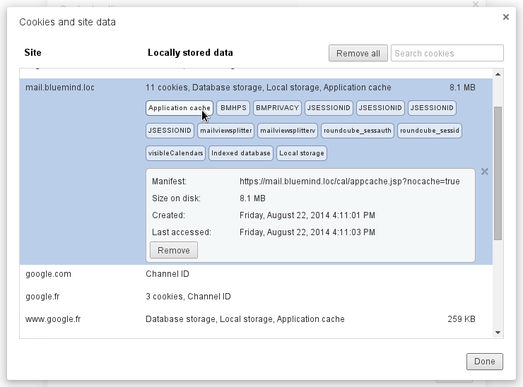 BlueMind client applications such as Calendar and Contacts are saved in the client browser's cache so that they can run in offline mode.