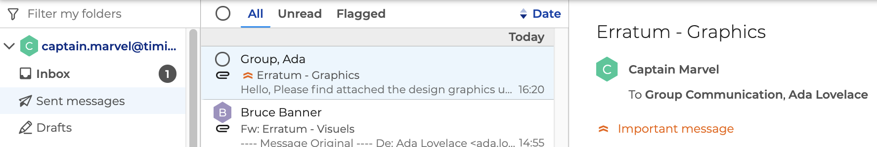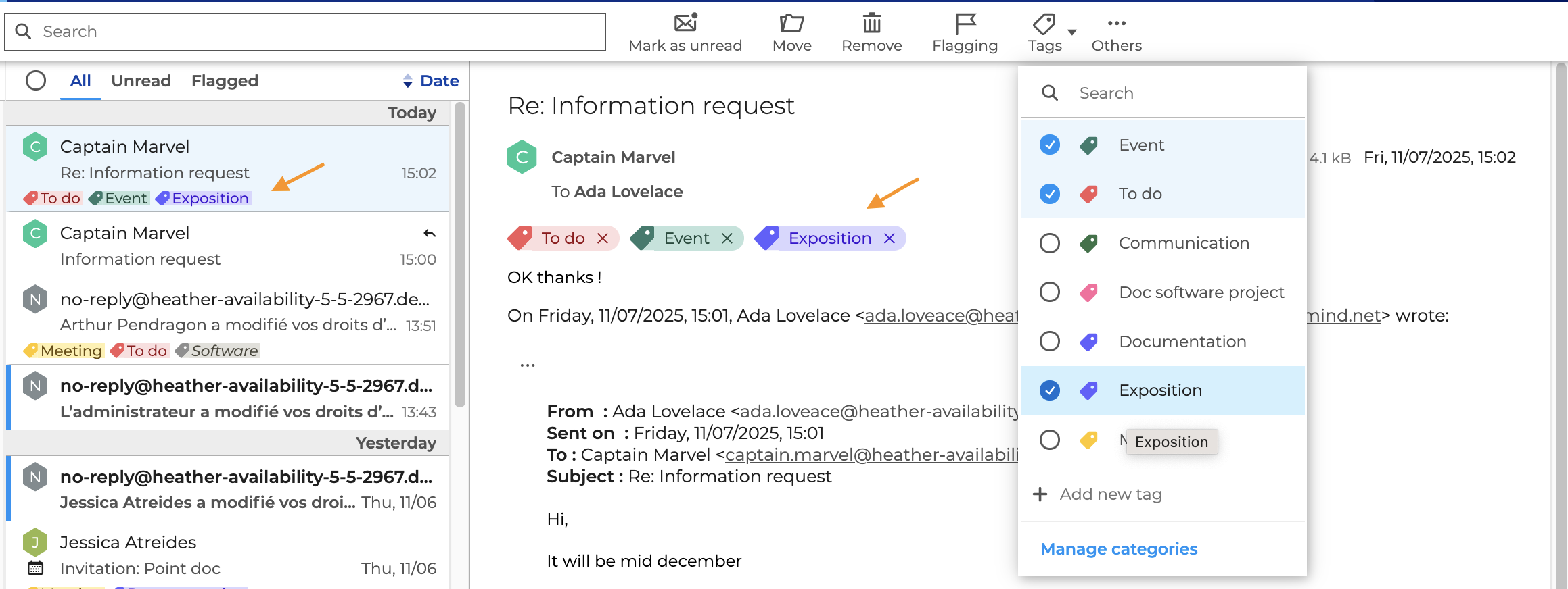 Shared mailboxes benefit from the new tags on e-mails feature (see below): users of the box can see and use its categories. The operation of these categories is compatible and unified with Outlook: users find the tags of an email in both Outlook and BlueMind.