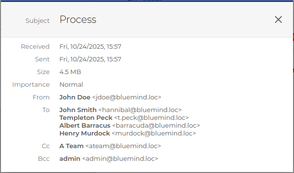 ↳ For further information, see Sending an important email - view detailed information such as received and sent dates, as well as facilitating copy/paste of addresses and access to contact files: